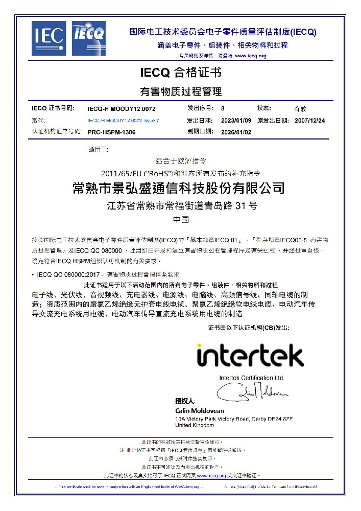 有害物質過程管理體系證書